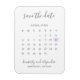 Moderno salve el imán de fecha con un calendario simple en gris suave con las palabras "Salva la fecha" y sus nombres en un elegante tipo de letra manuscrita y un corazón púrpura pastel que rodea su fecha, sobre un fondo blanco. CONSEJO DE DISEÑO: Para una columna que no tiene una fecha en la primera fila (semana), agregue un espacio antes del primer número. Si necesitas ayuda para personalizar el calendario, por favor siéntete libre de contactarme a través del botón de "contacto".