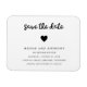 Minimalista guardar el imán de fecha con un diseño simple con las palabras, "guardar la fecha" en una letra manuscrita gruesa y un corazón por encima de los detalles del evento. Todos los elementos de diseño son negros sobre un fondo blanco. Una manera moderna y elegante de anunciar la fecha de su próximo boda.