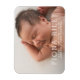 ¡Anuncien su manojo de alegría con estilo! Un fondo fotográfico de sangre completa y una tipografía simple pero clásica son las características de este moderno imán de anuncio de nacimiento. Simplemente edite la plantilla con sus detalles (el nombre de su bebé, las estadísticas de nacimiento y su nombre) y, a continuación, elija opciones de tamaño diferentes si lo desea. Puede cambiar los colores del nombre y del texto.