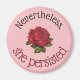 Esta moda de diseño antiguo muestra las palabras "Sin embargo ella persistió" en negro y rojo en la tipografía popular contra un fondo rosa pálido. En el centro del diseño hay un rosa rojo de época. Este diseño hace un gran regalo de aliento e inspiración para usted o una mujer o chica importante en su vida.
