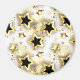 Patrón inexorable de joyería, oro y estrellas negras sobre fondo texturado claro. Estrella dorada.