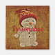 Un lindo muñeco de nieve con un gorra de punto sobre un fondo de burrega. Un adorable diseño rústico de invierno.