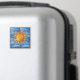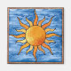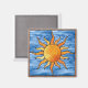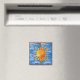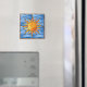 Hermoso sol de vidrio teñido de creación digital en cálidos naranjas y oro contra un cielo azul. Añade un toque de belleza a tu frigorífico.