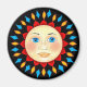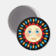 Una vívida cara celestial de sol irradia sol en este imán. Tiene colores amarillos, rojos, azules y naranjas sobre un fondo negro.