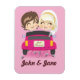 El novio y la novia manejan un automóvil rosa con una placa de auto recién casada y latas atadas al parachoque. Celebra tu día de bodas con este lindo y original diseño de Kakigori Studio.