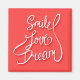 Tarjeta con elemento de diseño de tipografía dibujado a mano para posters de tarjetas de felicitación e impresión. Sonrisa amor sueño con pequeños nubarrones de corazones y sonrisa en el fondo rojo eps 10 | Bigstock® - Todos los derechos reservados.