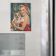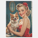 Este encantador ilustracion captura un radiante alfiler rubio en un vibrante vestido rojo, exuberante elegancia vintage con un toque juguetón. Su clásico hongo está adornado con un arco rojo a juego, y se accede con un collar de perlas y aretes brillantes. Junto a ella se encuentra un perro adorable y mullido con una expresión alegre, que le da un toque de alegría a la escena. En el fondo, una sala acogedora de inspiración retro con cortinas verde azuladas, un espejo decorativo y una lámpara de luz tenue que realza el ambiente nostálgico.