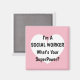 Soy un trabajador social ¿Cuál es tu superpotencia? Un imán de frigorífico de cocina. Buen eslogan humorístico. texto y colores personalizares. Cita divertida para cuidador, amigo, esposa, empleado, compañero de trabajo, colega, jefe, estudiante, mamá. Disponible en versión cuadrada y redonda con icono del corazón de amor. La idea de regalo de humor de oficina para el trabajo.
