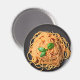 Platos de espagueti y salsa con albahaca en un imán gastronómico muy realista.