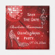 Elegante y glamoroso cumpleaños de Quinceañera salva los imanes de fecha. Glamour y glitz de moda Ahorra las fechas para las celebraciones de tu fiesta de cumpleaños de quinceañera. Hermosa y deslumbrante plata respira diamantes de joyas joyas de la imagen de la nota musical, divertida bola de espejo de la discoteca retro roja funky y estilete purpurinoso plateado a imagen de zapato de alta tecnología sobre un fondo rojo moda. Un bonito bonito, elegante, de moda, elegante, salva el imán de dátiles para los adolescentes. A los adolescentes les encantará este diseño genial, divertido, divertido y jovial para su música glamurosa y sus fiestas bailarines de quinceañera.