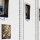A beautifully detailed oil painting of a black and white speckled hen surrounded by vibrant yellow roses and ornate wrought ironwork. Rich texture and golden tones create a timeless farmhouse aesthetic.