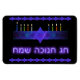 Una imagen fractal púrpura y azul, con un Magen David (Estrella de David), en el medio, como una menorah de Chanukkah. El motivo se repite como un borde superior e inferior. Se han encendido las velas. "Chag Chanukkah Sameach" (Feliz Chanukkah) aparece en un texto brillante. Todo en un fondo estelar.