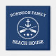 Elegante Refrigerador Cuadrado Magnet con su casa de playa personalizada, casa de lago, nombre familiar u otro texto con un ancla de un barco náutico personalizado, remos cruzados y estrellas en blanco sobre azul marino o elija los colores de fondo para la decoración.
