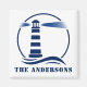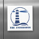 Elegante imán frigorífico con tu nombre familiar personalizado u otro texto y un personalizado faro clásico con olas oceánicas en azul marino sobre blanco o elige colores de fondo para que se correspondan con tu decoración. Hace un gran regalo único.