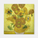 Los girasoles de Vincent Van Gogh, óleo sobre lienzo de 1889, es un cuadro de vida de quince girasoles brillantemente coloridos en un gran jarrón con un fondo amarillo ácido. Una gama de amarillos cálidos y contraste naranja con tonos fríos, salpicados por acentos oscuros y contornos audaces e insistentes, para un efecto de formas aplanadas que capturan la vida interior de las flores en el jarrón. Van Gogh pintó sus icónicos girasoles como una serie de pinturas para su Casa Amarilla en Arles, Francia, donde el pintor Paul Gauguin también vivió y trabajó por un breve tiempo. Vincent Van Gogh (1853-1890) fue un pintor holandés del movimiento post-impresionista conocido por sus dibujos audaces y expresivos, sus brochas y sus colores intensos y acentuados. A principios de la edad adulta Van Gogh trabajó como vendedor de arte, profesor y pastor antes de comenzar el estudio de dibujo y pintura a tiempo completo a finales de los 20 años. Influenciado por Rembrandt, la escuela Realistas del siglo XIX y Barbizon, las primeras pinturas de Van Gogh mostraron estudios de trabajadores y campesinos en tonos tierra sombríos. Al mudarse a Francia en 1886, Van Gogh se reunió con las sorprendentes innovaciones de los pintores impresionistas y comenzó a aplicar su enfoque al color y a la materia, que continuó en el estilo maduro por el que el artista es más conocido. Van Gogh produjo muchos cientos de dibujos y pinturas que incluían retratos, paisajes, pinturas de vida y flores y numerosos autorretratos que se convirtieron en una influencia dominante en el arte moderno del siglo XX y lo convirtieron en uno de los artistas más populares de todos los tiempos.
