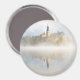 Imán fotográfico redondo con un amanecer nublado en el lago Bled con un reflejo de la isla con la iglesia en el agua estancada del lago y con el Castillo Bled al fondo en un hermoso día de otoño en Eslovenia.