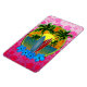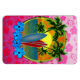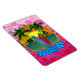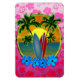 Hermosa puesta de sol en la playa detrás de tablas de surf y palmeras, enmarcada con flores de bambú e hibisco.Con un fondo rosa de tortugas hawaianas honu y flores de hibisco.