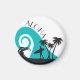 Diseño de olas modernas con silueta surfista en una playa de palmeras y saludo "Aloha".