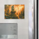 Esta impresión de lienzo representa una escena serena dentro de una exuberante jungla indonesia. El foco central es una estatua tallada de una deidad, probablemente de origen hindú o budista, sentada en una pose meditativa en un pedestal ornamental. La estatua se representa en un tono suave y verde azulado, contrastando con la cálida luz dorada filtrando a través del denso follaje. Otras estatuas similares bordean el camino, creando una sensación de espacio sagrado dentro del ambiente verde. La escena está bañada en un cálido y etéreo resplandor, que sugiere amanecer o puesta de sol, y la detallada representación del follaje de la jungla añade profundidad y realismo a la atmósfera mística.