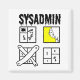 Texto de Sysadmin y un dibujo de cuatro ventanas. Uno con un vaso roto, otro con un abordaje. Sysadmin lanza sospechosamente desde detrás de la cortina de una ventana luminosa. Imán por diversión y buen humor.
