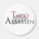 Imán Taco Assassin. Un imán con la frase "Taco Assassin" en la letra romana de Trajan sobre la silueta de un taco gris. Un gran regalo para los aficionados a los tacos, los videojuegos y la parodia.