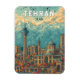Diseño de viaje vector retro de Teherán en un estilo emblemático. Teherán, la capital de Irán, combina la vida moderna de la ciudad con la antigua historia persa, ofreciendo a los visitantes una rica mezcla de bazares, museos, vistas a la montaña y arquitectura icónica como la Torre Azadi y la Torre Milad.
