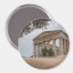 Imán fotográfico redondo con las ruinas del antiguo templo griego de Segesta, Sicilia en Italia visto bajo un viejo olivo en un día nublado.