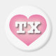 Este imán presenta un corazón rosado con un centro lavado de blanco que contiene las letras negrita, blanca y alta del funda TX, la abreviatura oficial de Texas, el estado solitario de la estrella.