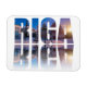 Texto de Riga compuesto por una foto de la famosa Casa de las Cabezas Negra y la Estatua de Roland sobre fondo negro con texto reflejado en agua. Atardecer cubierto de nieve en la Plaza del Ayuntamiento de Riga en invierno, Letonia