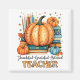 Celebrate educators with this vibrant fall-themed illustration that blends seasonal charm with heartfelt gratitude. A speckled orange pumpkin anchors the scene, surrounded by colorful books, pencils, mini pumpkins, and scattered autumn leaves. The bold message “Thankful–Grateful–Blessed TEACHER” honors the dedication and impact of teachers during the season of thanks. Perfect for classroom décor, teacher gifts, or seasonal inspiration in educational spaces.