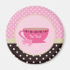 Un imán de círculo de tiempo de té con un puntito de polka rosa y marrón, adornado con un toque de diseño en el corazón, y una cinta rosada de bonito atada en una proa en la manija. Personalice agregando su nombre a las palabras: ¡Hora del té! ¡Un regalo perfecto para la muchacha a la que le encantaría traer un divertido fiesta de té dondequiera que vaya!