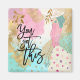 Un diseño abstracto moderno con las palabras motivadoras You Got This en negro para mostrarlo en tu refrigerador o regalarlo. Un chica simplista en un gorra que mira hacia abajo es a un lado un fondo de diseño en una mezcla de rosa, verde azulado y dorado con estrellas y motivos de hojas de oro.
