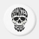 Cráneo en blanco y negro en negrita con tipografía curva 'embrujada'/'alma'; motivo gótico de alto contraste para fanáticos de Halloween, rock y ropa urbana que buscan un borde intrépido.