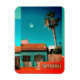 Una foto colorida de un pueblo español con un edificio tradicional, una luna creciente y una palmera. Valencia, Alicante.