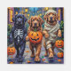 Terranova adorable vestida con lúgubres disfraces de Halloween llevan baldes de calabaza mientras truco o truco bajo el cielo iluminado por la luna. Este diseño festivo destaca la construcción masiva de la raza, el abrigo grueso y la personalidad gentil, capturando a la perfección la atmósfera espeluznante y divertida de la noche de Halloween. Una alentadora celebración para los amantes del perro y los hinchas de Halloween por igual.