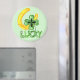 Alegre collage de acuarela ideal para el Día de San Patricio o cualquier otro momento en que quieras celebrar la suerte de los irlandeses. El diseño presenta un trébol verde / trébol de cuatro hojas con herradura dorada y la palabra SUERTE en verde y lunares blancos.