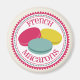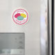 Un imán con un ilustracion de tres macarones franceses (rosa, azul y amarillo) dentro de un círculo decorativo rosa y azul con texto rosa.
