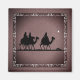Una silueta de los Tres Sabios montando camellos siguiendo la estrella de Belén sobre un descolorido fondo de arpillera de chocolate con un borde de fibra blanca. Créditos de la imagen: Pixabay.com imagen #1299283, imagen# 488204