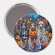 Perros de ganado australianos adorables vestidos con juguetones disfraces de Halloween llevan baldes de calabaza mientras truco o truco bajo el cielo iluminado por la luna. Este diseño festivo destaca el abrigo de la raza, los ojos inteligentes y el espíritu energético, capturando perfectamente la atmósfera espeluznante y divertida de la noche de Halloween. Una animada celebración para los amantes del perro y los hinchas de Halloween por igual.