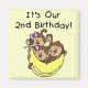 Tres monos pequeños, dos chicas y un niño, y un gran plátano amarillo en camisetas Triplets del segundo cumpleaños, trajes de ropa, bolsas de tote, tarjetas, pegatinas, imanes y mucho más.