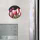 Tulipán rojo y blanco contra un motín de tulipanes rosados en flor en un imán de nevera