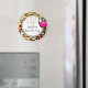 Un imán para una despedida de soltera. Un patrón de manchas leopardo para un fondo. Una copa de vino de aspecto fresco con una tinta negra espesa. El vino que hay en el interior de la copa es rosado. Colores vivos y luminosos. Personaliza con tu información de soltera en un círculo dibujado a mano blanca. La última vez antes del anillo escrito en un moderno tipo de letra. Una imagen de falso purpurina de oro da las ilusiones de purpurina rociado en la parte superior.