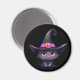 Magnet con un divertido ilustracion temático de Halloween para los amantes del gato. Un gato negro de ojos grandes vestido con el gorra de una gran bruja negra con un cinturón rosado violáceo alrededor del borde.
