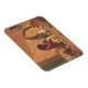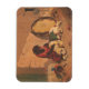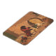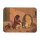 Huella vintage de un mono y un perro esperando afuera, al lado de una pared donde se está inclinando una gran pandereta, cerca de una puerta, con el gorra del mono en el suelo. alrededor de 1876