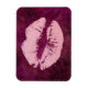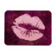 Un imán con labios de imitación purpurina rosados de moda. El fondo es de color rosa oscuro rojizo con hojas tropicales de palma.
