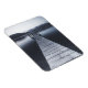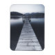 Esta foto en blanco y negro muestra un muelle de madera que lleva al agua.