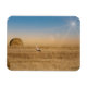 Una cigüeña blanca ( Ciconia ciconia ) se encuentra entre pacas de heno en un campo cosechado con el sol