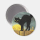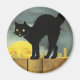Vintage ilustracion de Halloween mostrando un gato negro en una valla con la cara de la luna detrás.