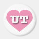 Este imán presenta un corazón tranquilo y fresco de color rosa que contiene las letras en negrita, blanca y alta del funda UT, la abreviatura oficial de Utah, el estado de la colmena.