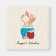 Añada un toque de intimidad a su cocina con este bonito imán de estilo rústico con un juego de cucharas de madera y utensilios de cocina a mano en una olla turquesa rodeada de una deliciosa manzana roja y fruta fresca. Este diseño temático de cocina de campo tiene un fondo de madera clara.
